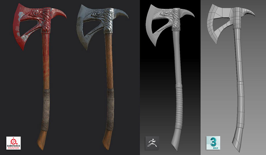 An axe for Conan Exiles mod. From left to right bloodied material, clean material, sculpt, and low poly. Blood is gradually applied by shader on runtime every time you hit.