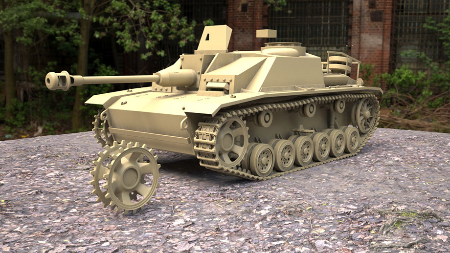Work in progress - Stug III Ausf. G. This model has been waiting for its paint for a while now. It has working physics for treads - using only built in 3Ds Max physics. No plugin.